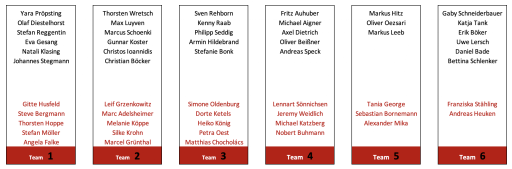 Jedes der sechs Challenge-Teams (Team 1 bis 6) setzt sich zusammen aus Kolleg:innen von Vertrieb, Draw & Design, Technischem Service und Kundenbetreuung.