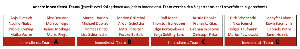Unterstützt werden die Challenge-Teams von unseren vier Innendienst-Teams (Team A –D). Und natürlich sollen auch unsere Innendienst Kolleg:innen am Wettbewerb teilhaben – deshalb losen wir im Finale aus den 4 Innendienst-Teams jeweils zwei Kolleg:innen aus, die den beiden Siegerteams für ihre Teamtour zugerechnet werden.